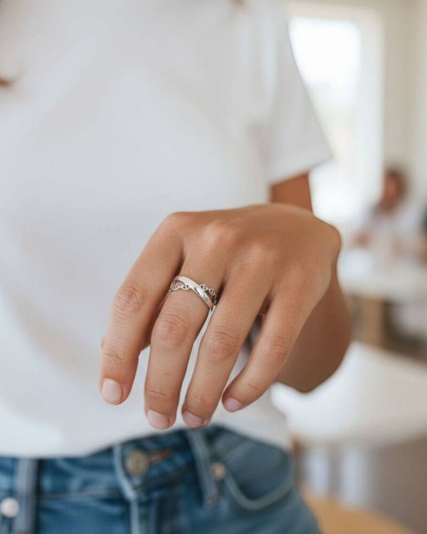 Bague argentée en acier inoxydable, au design sobre et raffiné.